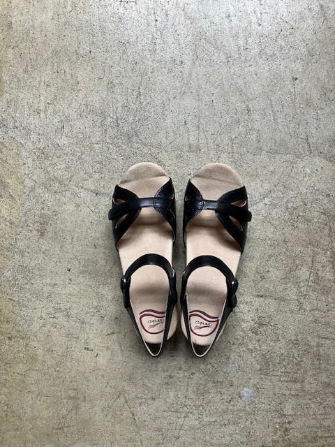 足首のベルトには、シンプルな真鍮色のバックルが。