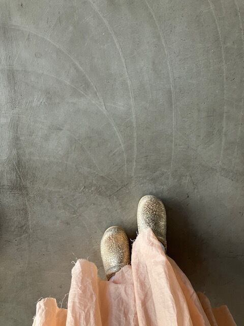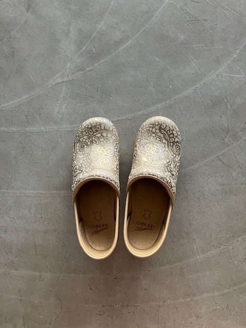 ゴールド色のレース模様の立体的な型押しに、ベースはクリーム色でワントーンの落ち着いた色合いです。白木のような木目調のソールと色調があって、足元を輝きプラス柔らかな雰囲気でまとめてくれます。