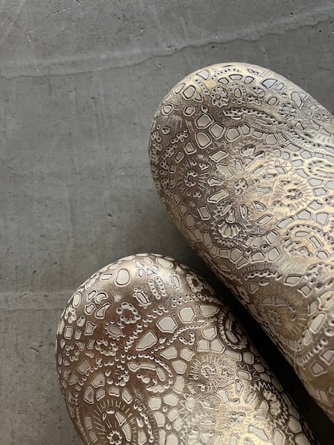 ゴールド箔のレザー型押し。趣のあるレース柄。