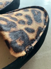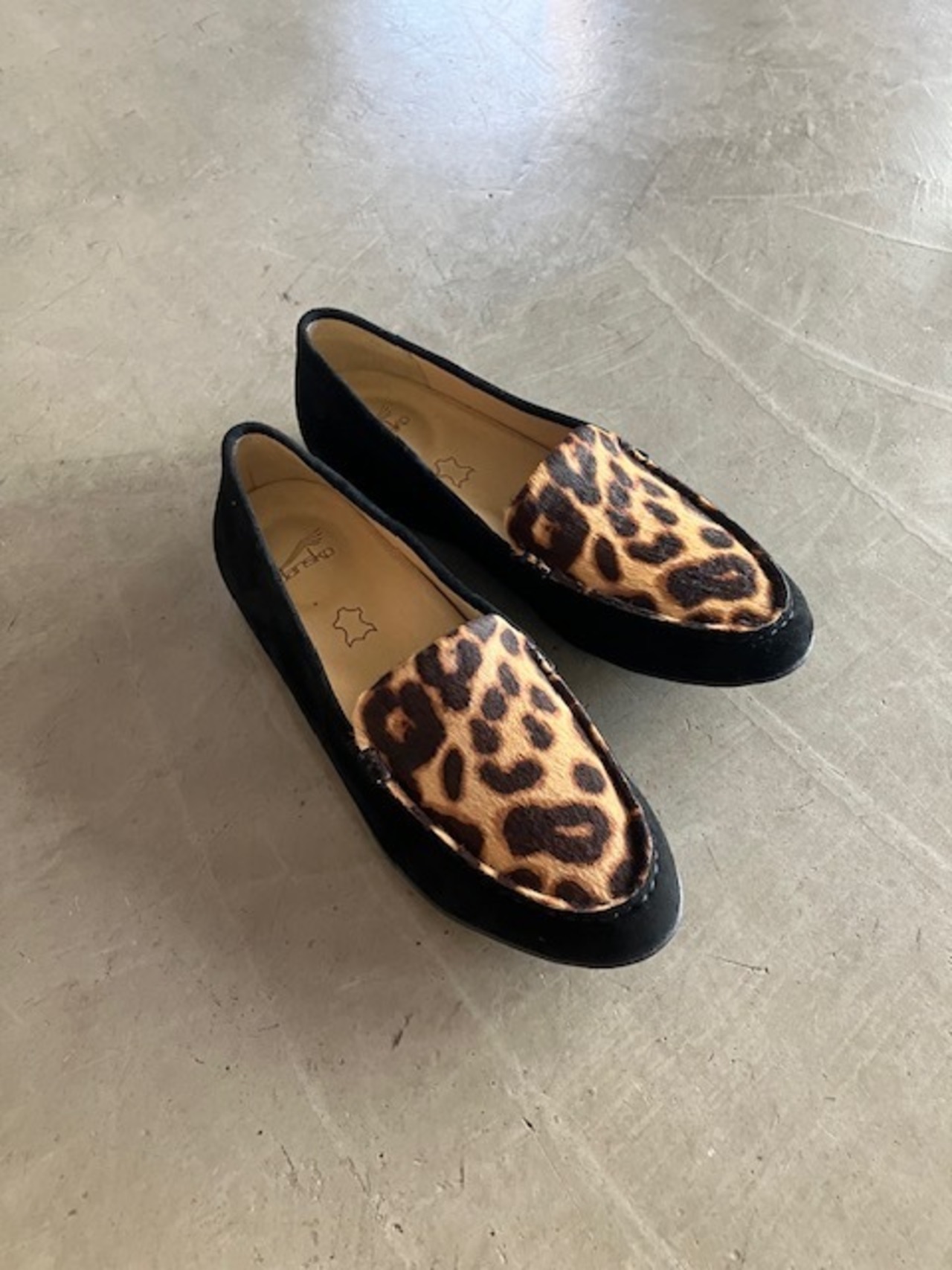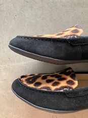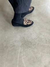 ハラコのレオパードとスエードのブラックの2トーンでシックなカジュアルスタイルをグンと引き立ててくれます。
